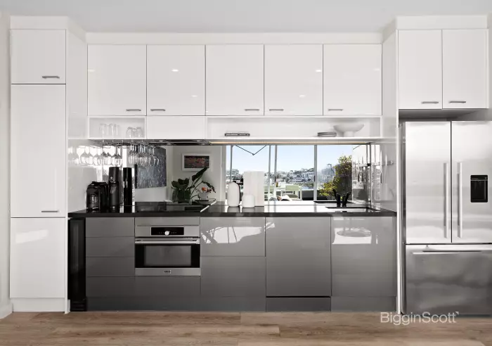 - Accommodation includes a spacious, open plan living/dining zone where a sleek streamlined kitchen with quality appliances and light-reflecting mirrored splashback takes pride of place.