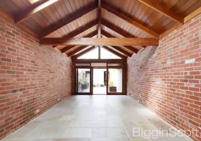 An impressive open-plan living and dining area showcases soaring vaulted ceilings, exposed brick accents, and abundant natural light from a Velux skylight. Sliding doors connect seamlessly to a private courtyard oasis with built-in gas fittings and power for outdoor cooking, while the secure rear-access garage (with roof storage) adds rare practicality.