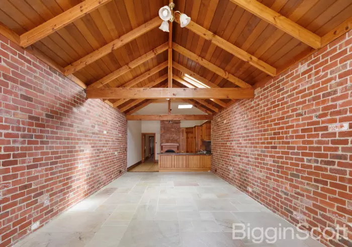 Inside, a wide hallway with polished Baltic pine floors introduces two spacious bedrooms, complemented by a stylishly renovated bathroom with integrated laundry facilities. At the heart of the home, a well-appointed country-style kitchen features stone benchtops, quality appliances (Miele, Bosch, Electrolux), and a cosy gas fireplace—perfect for both everyday living and entertaining.