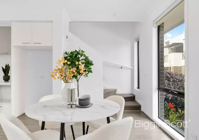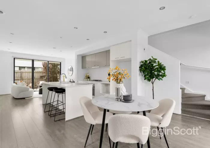 This contemporary three-bedroom townhouse offers a private and practical layout, with all bedrooms located upstairs, separate from the lively open-plan living areas on the ground floor. The master suite is a true retreat, complete with a built-in robe and ensuite, while the spacious living, dining, and kitchen zones flow seamlessly outdoors to a private courtyard – perfect for entertaining or quiet relaxation.