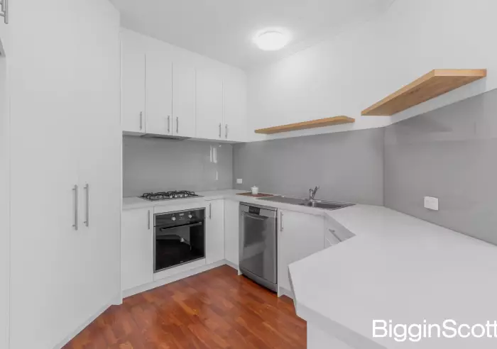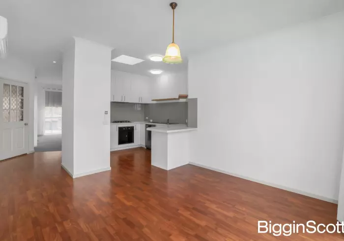 The spacious living area features large windows that invite natural light while offering leafy outlooks to the private courtyard. At the heart of the home, the modern kitchen features a gas cooktop, oven, dishwasher, breakfast bar and ample storage, adjoining the warm timber-floored dining area for easy living.