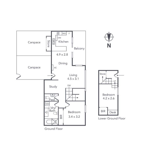 The home features two generously sized bedrooms: one on the main floor with built-in wardrobes, and a retreat downstairs with its own built-in wardrobes and dedicated desk space—ideal for remote work or study.