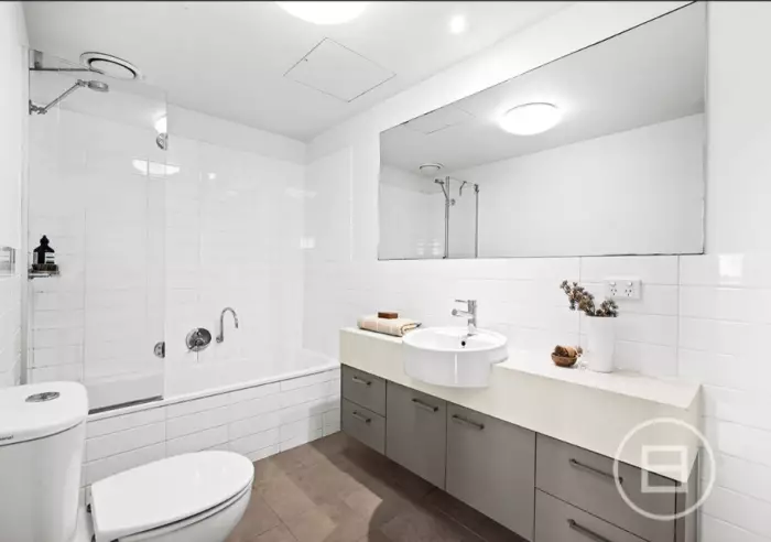 * Modern central bathroom with shower over bath, large vanity, and integrated laundry facilities