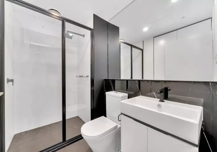 - A sleek monochrome central bathroom with rain shower and laundry facilities.