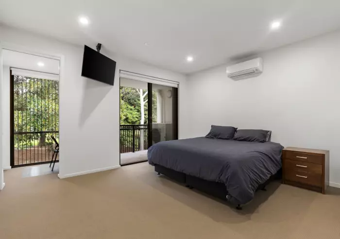 The versatile floor plan includes a ground-floor bedroom with built-in robes and a powder room, ideal for flexible living arrangements. Ascending the striking floating staircase, you'll find two additional bedrooms and a fully-tiled main bathroom. The expansive main suite is a serene haven, offering breathtaking park views, extensive built-in storage, a luxe en-suite, and a study nook.