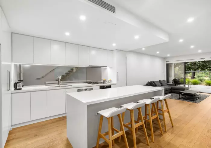Timber flooring flows throughout the ground floor, showcasing an ultra-spacious living and entertaining zone. The kitchen is a culinary centerpiece, featuring a stone waterfall island for casual dining, premium Miele appliances for seamless cooking, and soft-touch cabinetry that merges style with function. Glass sliders open to an al fresco courtyard, framed by greenery with direct gate access to the park…one of only a select few residences offering this exclusive connection.