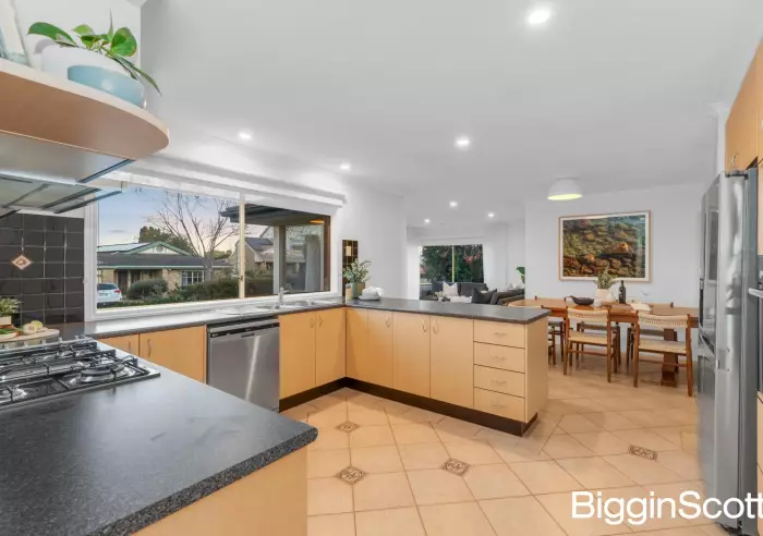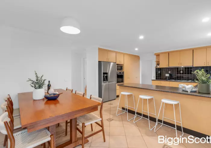 Step inside to discover generous living zones, including a light-filled formal lounge with a bay window and a tiled family room ideal for casual gatherings. At the heart of the home, the well-appointed kitchen is designed for modern living, featuring stainless steel appliances, gas cooking, ample storage, and a breakfast bar for quick meals or morning coffees.