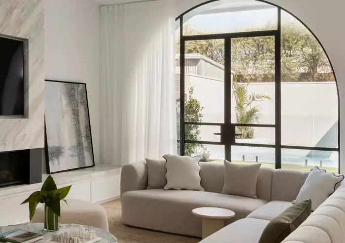 Designed for those who love to entertain, the rear is where the home truly comes alive. A showcase wine display cellar and open-plan living/dining domain, warmed by a gas fire, unfold towards the garden through arched steel doors and French windows, connecting to a poolside scene straight out of the Mediterranean. White and soft-blue tones reflect from the self-cleaning, solar-heated pool, an al-fresco pavilion with plumbed BBQ, and the gorgeous, honed marble kitchen with Miele appliances and an extensive butler’s pantry framed by a fiery red maple. A single remote garage, with access via Allison Road, doubles as an entertainment, home gym or wellness space with a full bathroom and bi-fold doors opening to the pool.