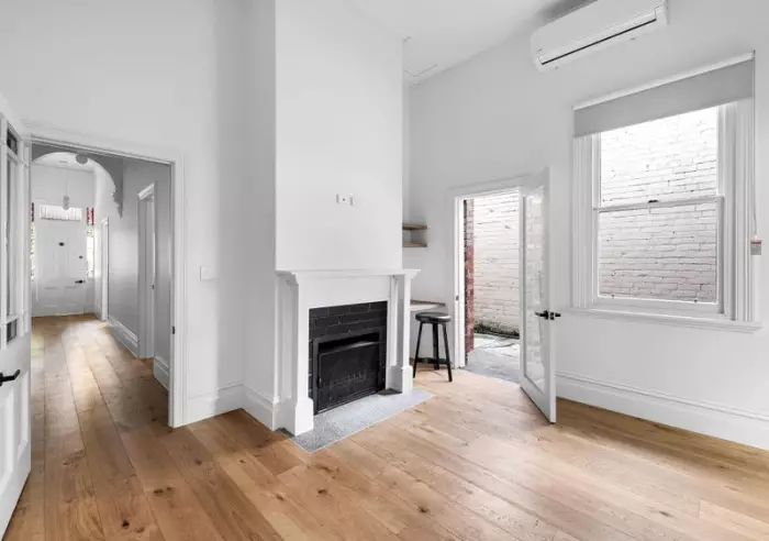 - Bright living space across engineered timber floors, decorative fireplace, built in study nook and split system heating/cooling