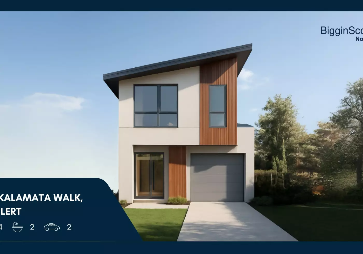 • Contemporary skillion roof elevation with smooth rendered finishes per approved plans; indicative facade render provided for marketing. Colours, materials and detailing may vary-refer to contract and selections.