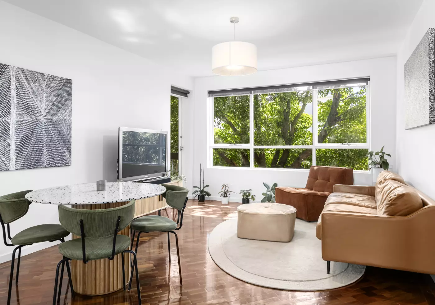 Leafy outlooks filter the bright northern light that complements a living/dining domain featuring elegant parquetry floors, reverse cycle heating/cooling and balcony aspects while the separate kitchen’s stone benches, central island and stainless steel appliances serve in style.