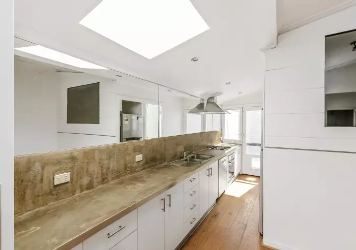 *Galley kitchen with polished concrete benches (Fridge Inc)