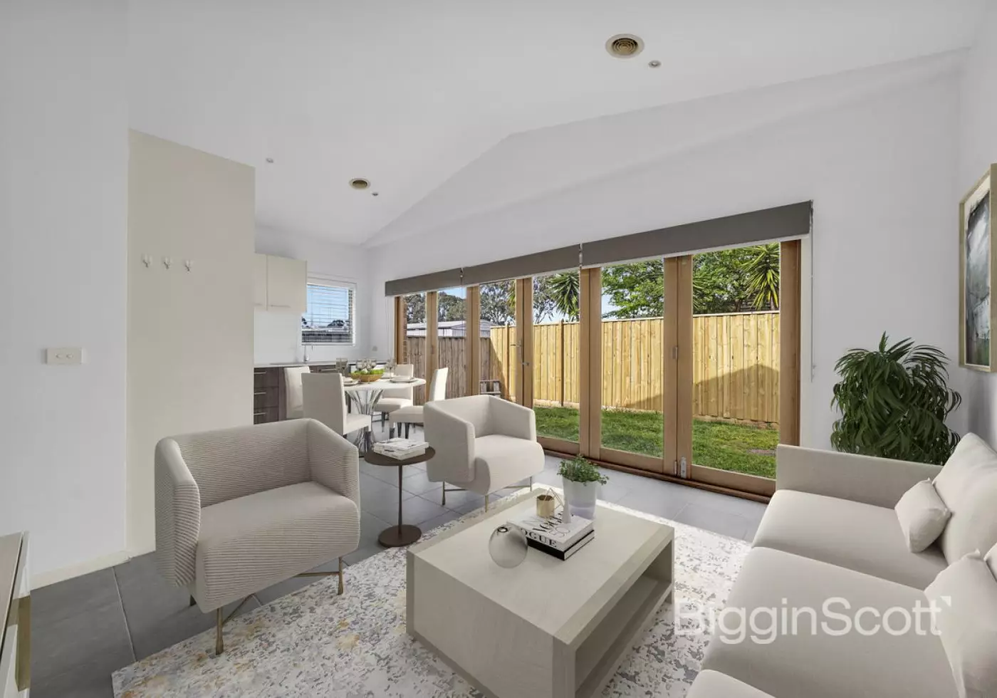Step inside and be welcomed by a bright, open-plan living and dining zone, featuring high raked ceilings, sleek tiled floors, and modern downlights. Bi-fold doors open out to a lush landscaped garden, perfect for both outdoor entertaining and quiet relaxation.