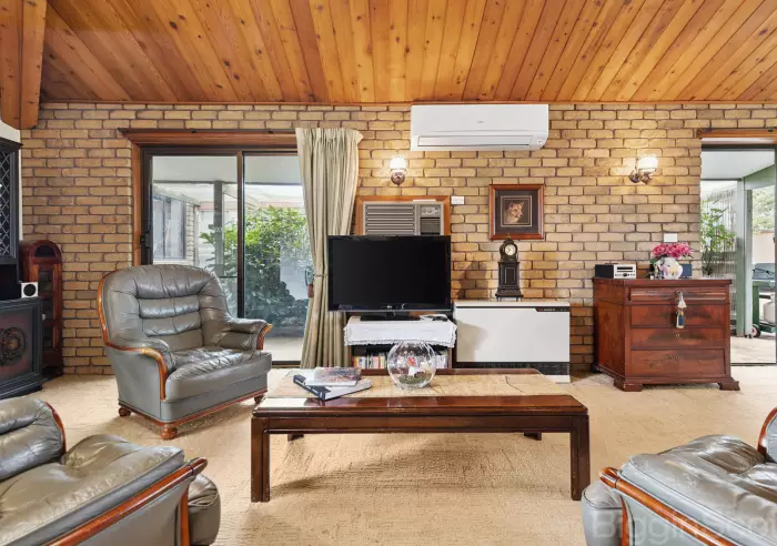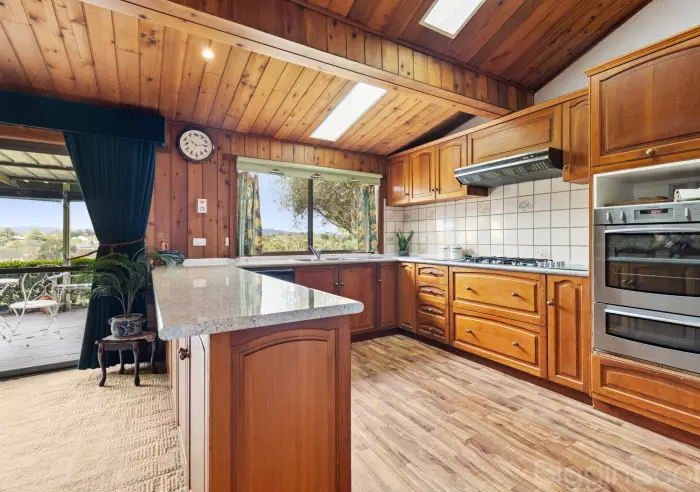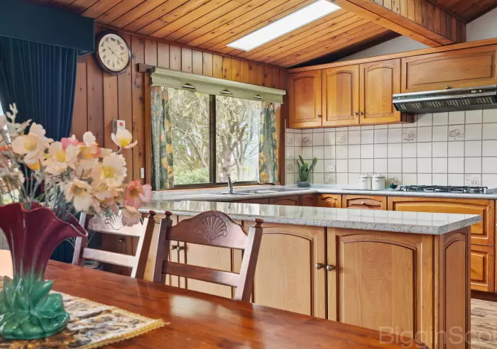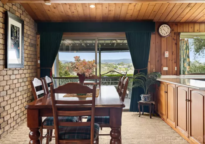 Step inside to a spacious open-plan layout where timber-lined ceilings and exposed brick walls create a timeless, homely atmosphere. The central living and dining area provides an inviting space to relax or entertain, while large picture windows frame the scenic outlook and fill the home with natural light. The adjoining kitchen features excellent storage, stone-look benchtops, and a gas cooktop, ideal for family cooking and weekend entertaining alike.