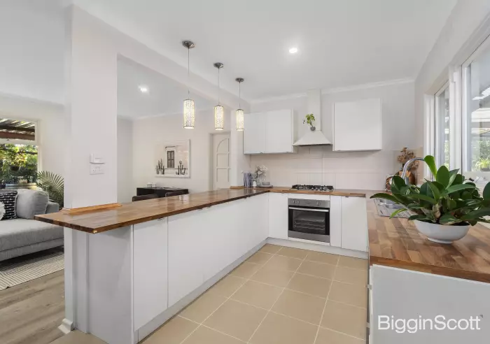 The single-storey interior features stylish new flooring throughout and a surplus of radiant natural light. The open plan lounge with gas heater and split system unit adjoins the dining area and kitchen that has been updated to perfection. Now featuring an inviting breakfast bar, butcherblock benchtops, gas cooktop, stainless steel oven and dishwasher, and designer pendant lighting, this kitchen will inspire cooking for loved ones. When entertaining, take dining outdoor to the spacious covered deck overlooking the leafy garden.