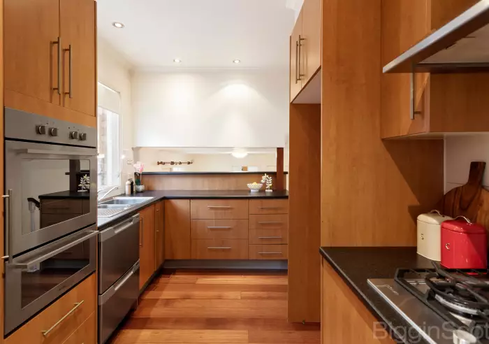 Entry level; an L-shaped living and dining room features polished floorboards, ducted heating and a central kitchen with stainless steel appliances, gas cooking and dishwasher.