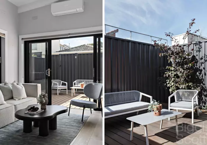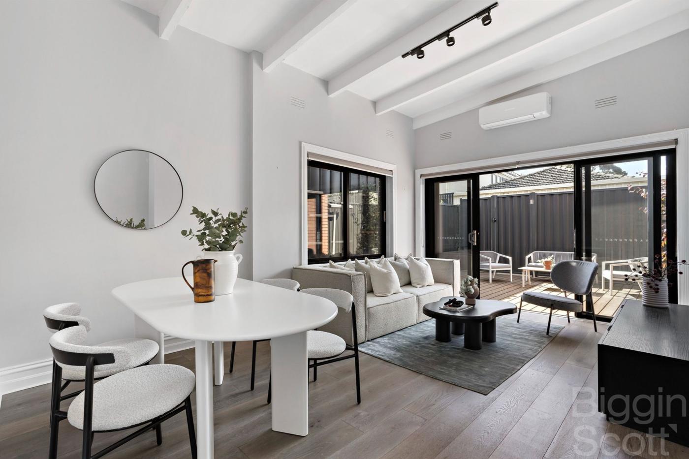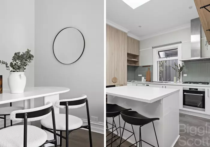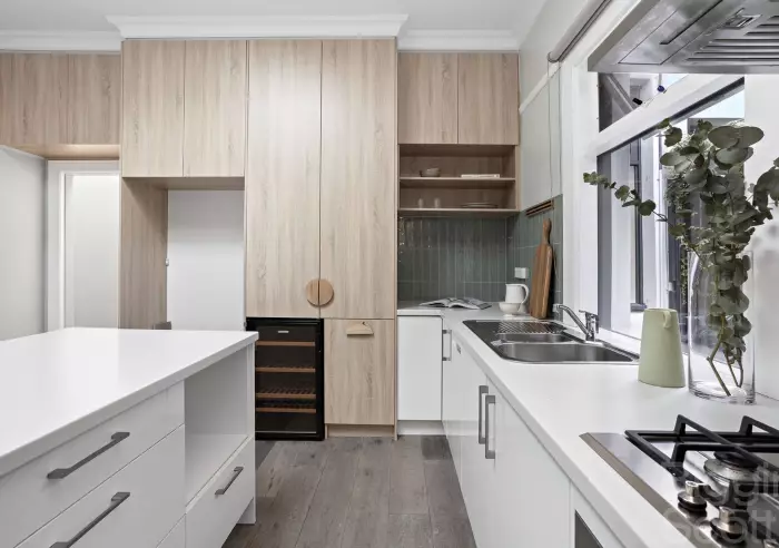 - An island bench in the kitchen is perfect for the first drink before heading out to the sundrenched alfresco dining deck complete with pedestrian access to a rear laneway.