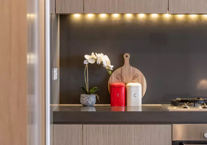Floor to ceiling glass complements the living area and bedroom, providing natural light all year round as well as providing extraordinary bay views, while the balcony creates the perfect space to relax at the end of the day with a glass of wine.