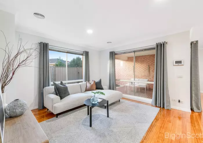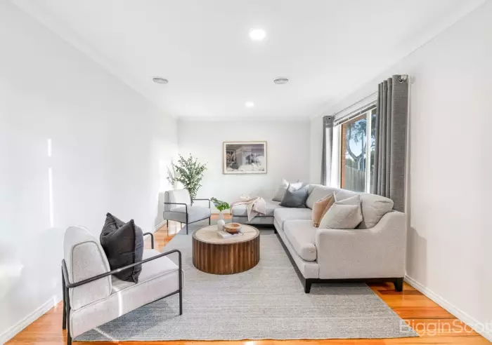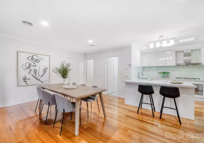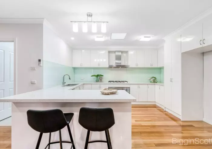 The central kitchen is stylish and practical, complete with stone benchtops, stainless steel appliances, and plenty of storage, flowing effortlessly to the open-plan living and dining areas, undercover alfresco, and low-maintenance courtyard.