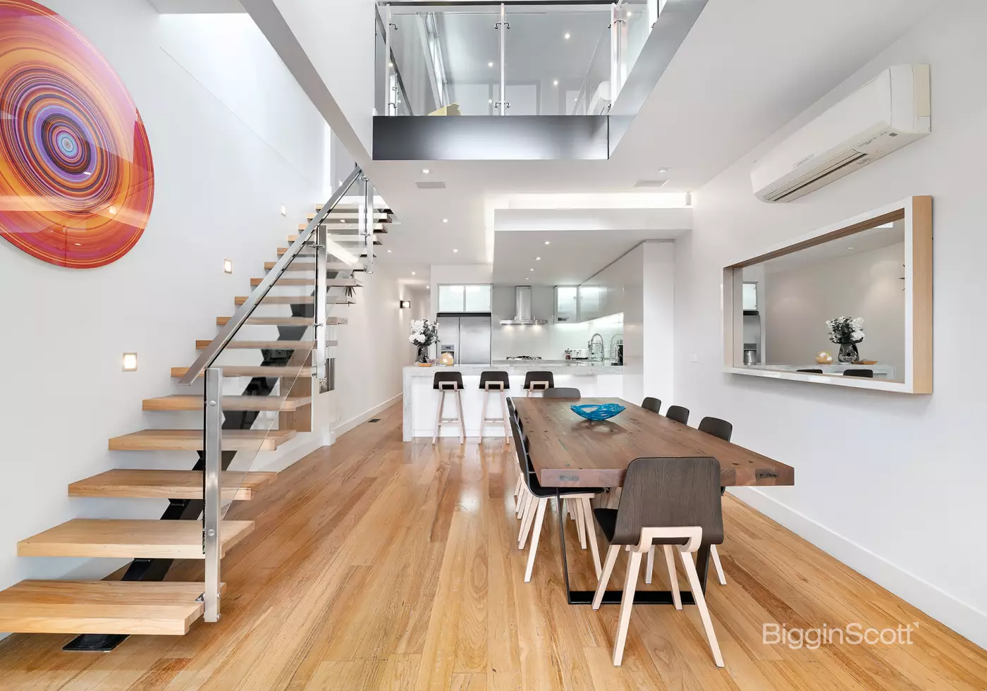 - Two dramatic living zones featuring impressive ceiling heights