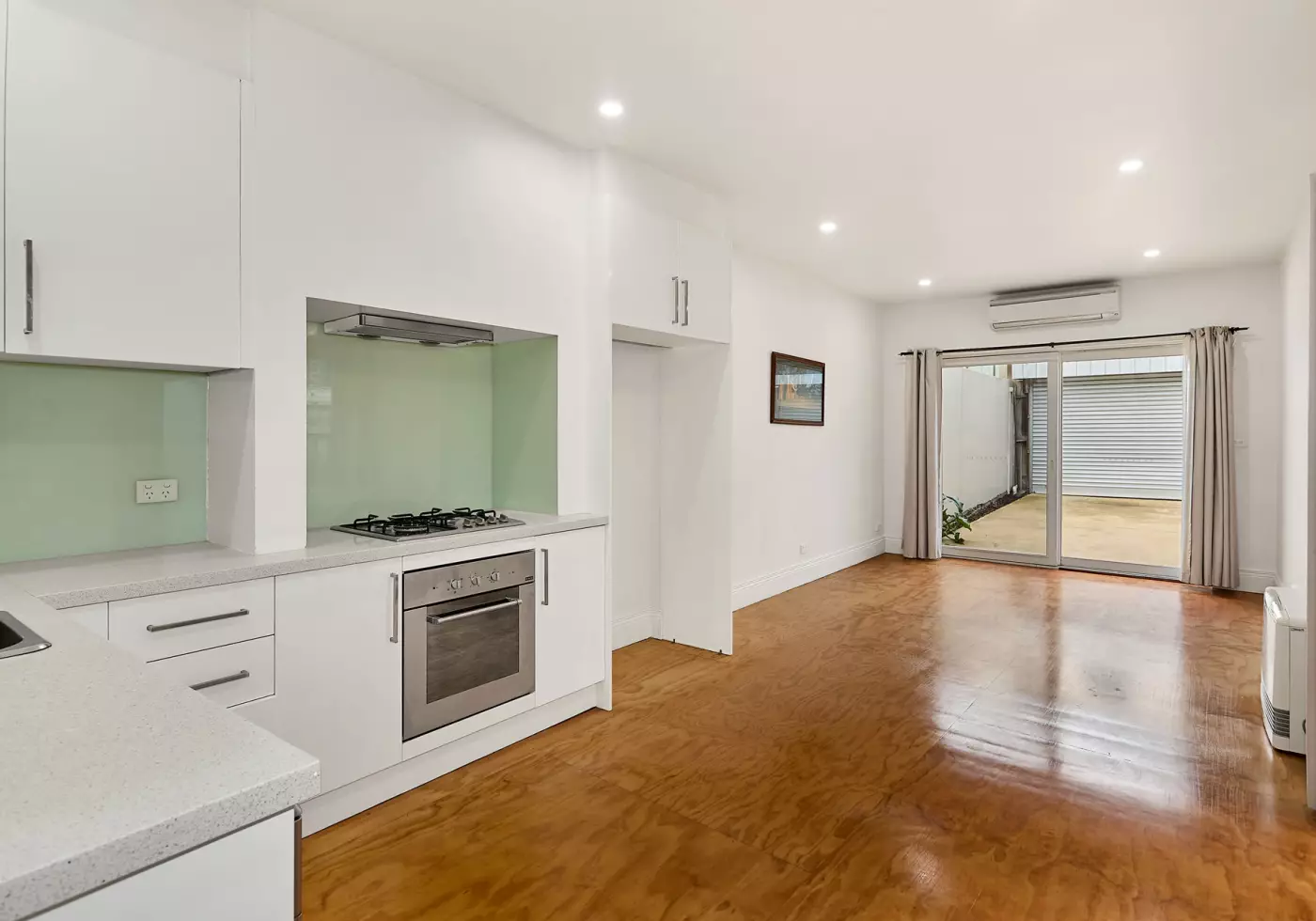 - Light-filled living and dining zone at the rear extending from a modern kitchen with stone benchtops and stainless steel appliances.