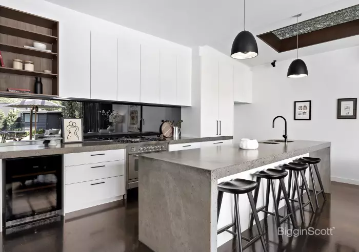 - A striking waterfall-edge concrete island anchors the sophisticated gourmet kitchen, which is equipped with premium appliances including a 900mm freestanding oven.