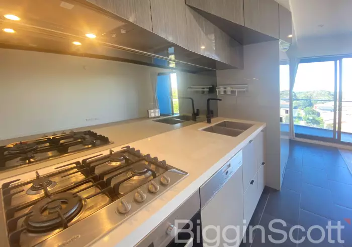 The contemporary kitchen features stone benchtops, quality appliances, and ample storage, offering a perfect space for cooking or entertaining. A private balcony extends your living zone, ideal for morning coffee or unwinding in the evening.