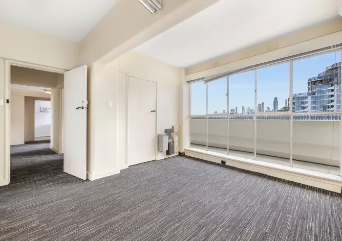 Currently configured as an office this magnificent fifth floor corner allotment (110sqm approx) is bathed in natural light and showcases uninterrupted panoramic views across Albert Park Golf Course and Albert Cricket Ground.