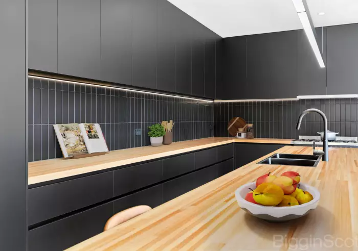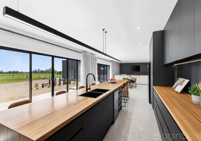 - Designer kitchen with timber island, walk-in pantry, and quality appliances.