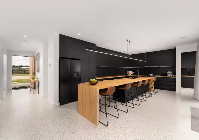 Behind the striking dark cladded façade lies an interior of impressive scale and sophistication. Expansive light-filled spaces flow effortlessly, led by an open-plan living and dining domain that forms the heart of the home. The gourmet kitchen showcases exquisite timber accents, anti fingerprint cabinetry, premium European appliances, a vast island bench, almost 5 metres long, and a full walk through gallery style Butler's pantry, a true showpiece for entertainers.