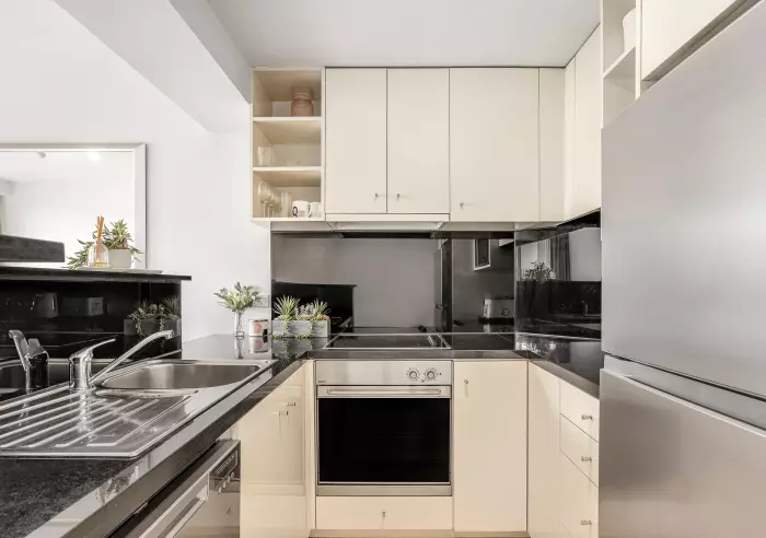 – Sleek kitchen with stone benchtops and stainless steel appliances