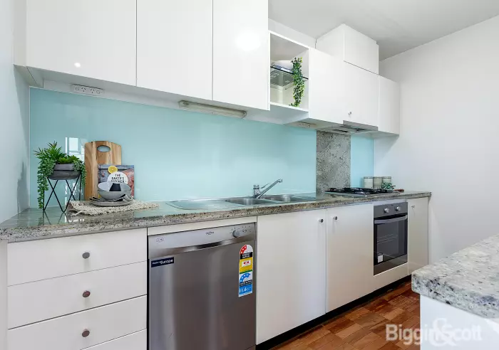 This spacious apartment of 90 sqm (approx) includes 2 bedrooms with BIR (main with ensuite), 2 bathrooms, L-shaped lounge/dining room with granite kitchen, separate laundry and a sizable balcony with panoramic views to the bay and the City.