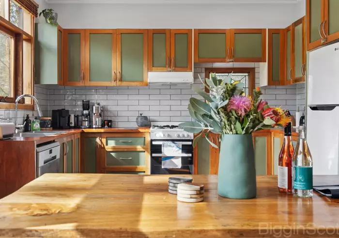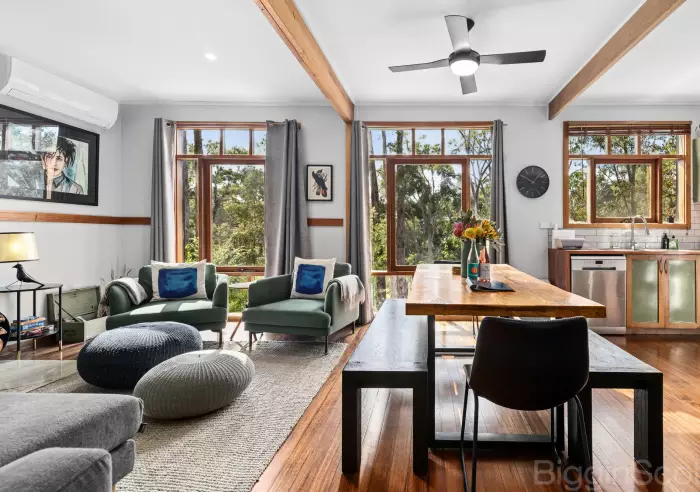 Thoughtfully renovated throughout, highlights include herringbone-tiled bathrooms, custom timber windows, and a seamless connection to outdoor living. The north-facing deck is the ideal place to unwind, entertain, or simply enjoy the serenity of the surrounding bushland. Positioned adjacent to Crown land and the Hepburn Springs Golf Club, and within easy reach of cafés, galleries, and the iconic Bathhouse precinct, this property captures the essence of relaxed spa-country living.