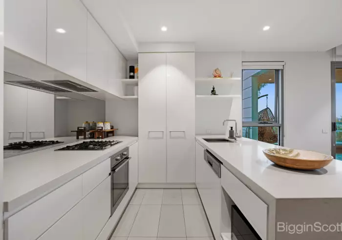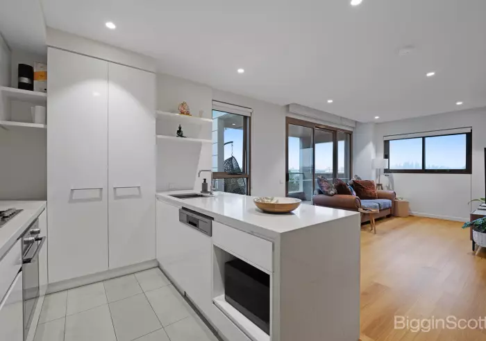 The welcoming entry leads through to the light filled open plan living and dining area, with split system, that seamlessly opens onto the large balcony framing the city skyline, making it an ideal sanctuary at the end of the day, for family and guests
