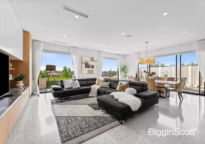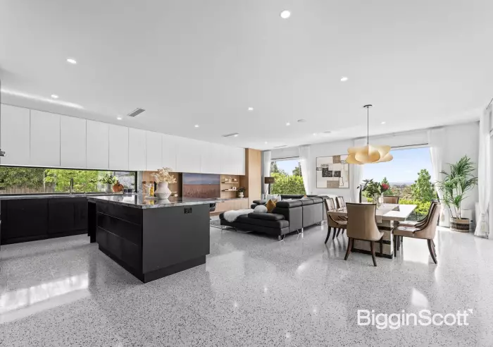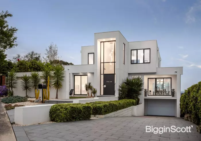 Bravely standing out from the crowd with a bold modernist façade and magnificent views, this spectacular residence offers an unforgettable family lifestyle where dramatic spaces, striking style and high-calibre luxury underpin every facet living and entertaining. Offering an immediate sense of scale and prestige, the stunning foyer showcases a soaring double height ceiling void with panels of floor-to-ceiling glass and beautiful terrazzo tiles. Adorned with a gas log fire, the lounge and dining room is brilliantly flanked by glass sliding doors to offer excellent cross ventilation, whilst filling the space with natural light. Each side flows out onto an alluring outdoor area. At the front, a glorious balcony overlooks the landscaped yard, while at the rear a terrace forms the ideal space for alfresco dining. The gourmet kitchen is ready for catering, equipped with stone benches/splashbacks, Wolf appliances (oven, steam oven and 900mm cooktop), built-in SubZero fridge, integrated Miele dishwasher, push-close cabinetry with electric bin drawer, island breakfast bench and butler’s pantry with second Miele dishwasher. The architecture and design truly shine in the vast open plan family and meals zone where a panoramic outlook is displayed through large picture windows. Catering for the expanding family, there are five bedrooms, complemented by a built-in study nook and a 2-person study. The ground floor bedroom boasts a fitted walk-in-robe, ensuite and access onto the front patio. Upstairs, a spacious retreat accompanies the remaining four robed bedrooms. The luxurious master boasts a walk-in-robe with make-up vanity, ensuite and spectacular views. Further serviced by a twin vanity family bathroom, powder room and laundry. An additional bathroom rests on the basement level, providing convenience for those enjoying a movie in the home theatre (with kitchenette), splashing in the solar-heated in-ground pool and spa, or working on the car in the massive 4-car garage with workshop. Completing the picture, you'll find heated towel rails, high ceilings, ducted heating/air conditioning, hydronic heating, double glazing, solar panels, alarm, CCTV, ducted vacuum, laundry chute and a side gate leading from the backyard to Tasker Reserve Playground. Brilliantly positioned to deliver a fabulous lifestyle, moments from Ted Ajani Reserve, Macedon Plaza, Bulleen Plaza, Westfield Doncaster Shopping Centre, Templestowe Valley Primary, Templestowe College, Marcellin College, buses and the Eastern Freeway.