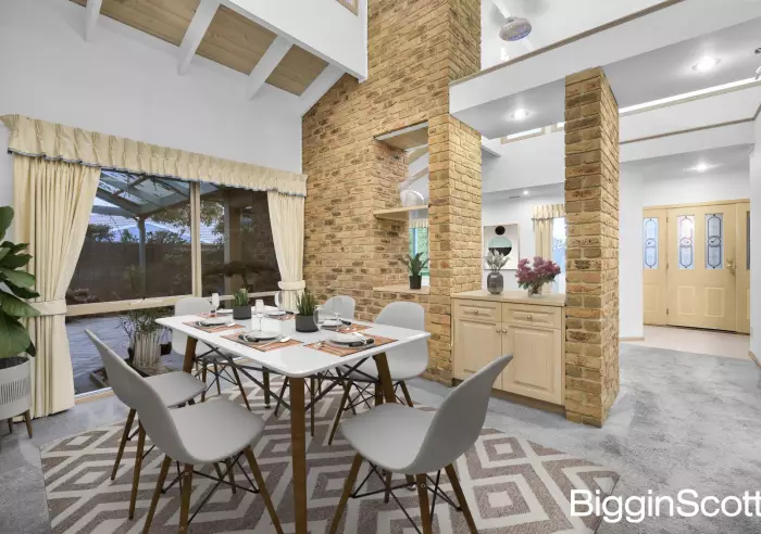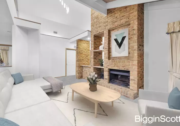 The formal lounge and dining area set the scene for refined living, where soaring raked ceilings enhance the sense of space and a wood fireplace framed by exposed brick creates a striking centrepiece for cosy winter evenings.