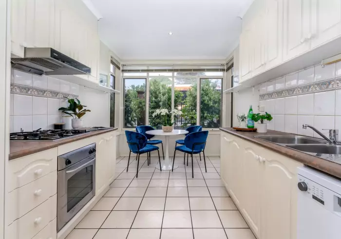 Inside, the atmosphere is calm and inviting. Wide double doors open from the living area to the terrace, flooding the space with natural light and creating an effortless indoor-outdoor connection. The kitchen is timeless and practical, featuring crisp white benchtops, classic shaker cabinetry and an adjoining meals area bathed in morning light.