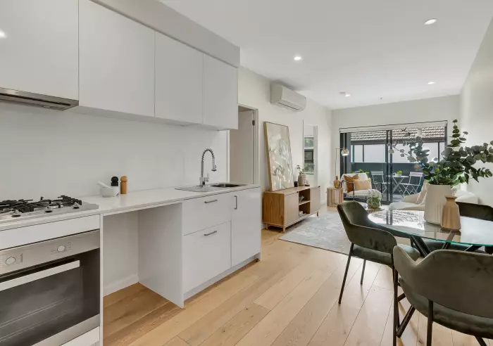This stunning 2-bedroom, 2-bathroom apartment in Hawthorn East combines modern design with spacious, low-maintenance living, just moments from the vibrant Camberwell Junction Shopping Strip. With tree-lined north-facing views, the apartment offers a spacious living and dining area featuring wide timber floors, a sleek stone kitchen with soft-close drawers and premium Miele appliances. The living area opens to a generous undercover balcony, ideal for year-round outdoor entertaining.