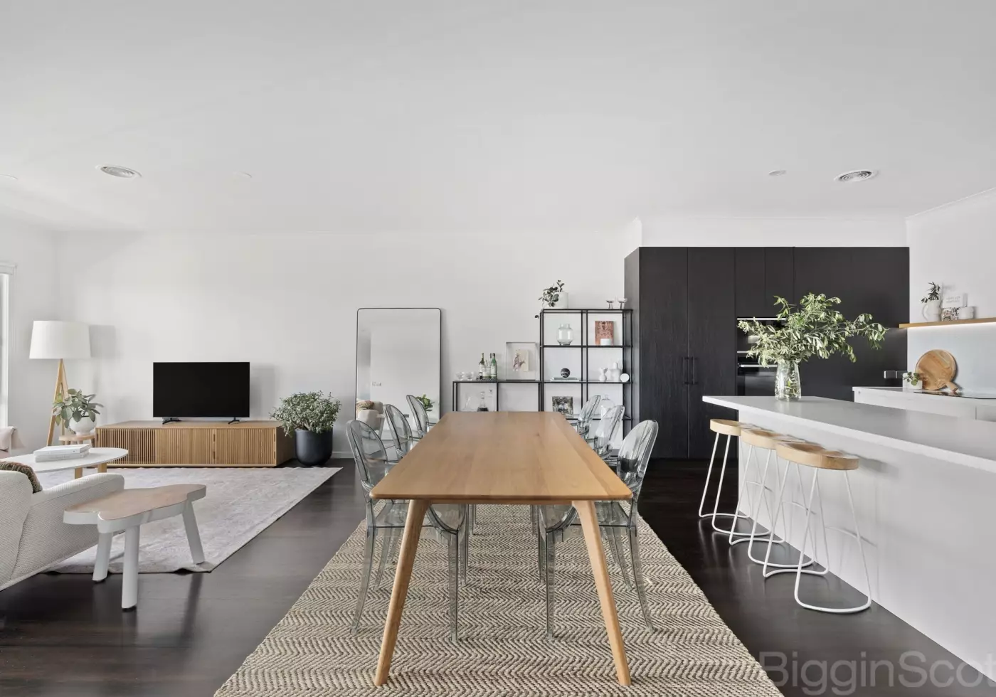 Every surface, every fitting speaks to quality. Engineered timber flooring flows throughout the living spaces, while plush carpets add warmth to the bedrooms. The central bathroom showcases designer finishes, and a guest powder room adds an extra layer of convenience. A separate laundry and storage box room ensure the practical side of life is well catered for, while heating and cooling keep you comfortable year-round.