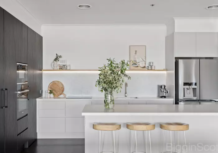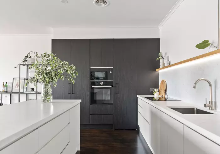 The heart of the home reveals itself in the open-plan living zone. Here, a gourmet kitchen commands attention with its sweeping stone countertops and premium European appliances – a space that invites both everyday family meals and sophisticated entertaining. The living and dining areas flow naturally from this culinary hub, extending onto an alfresco balcony where bay and city views provide a stunning backdrop to your morning coffee or evening drinks.