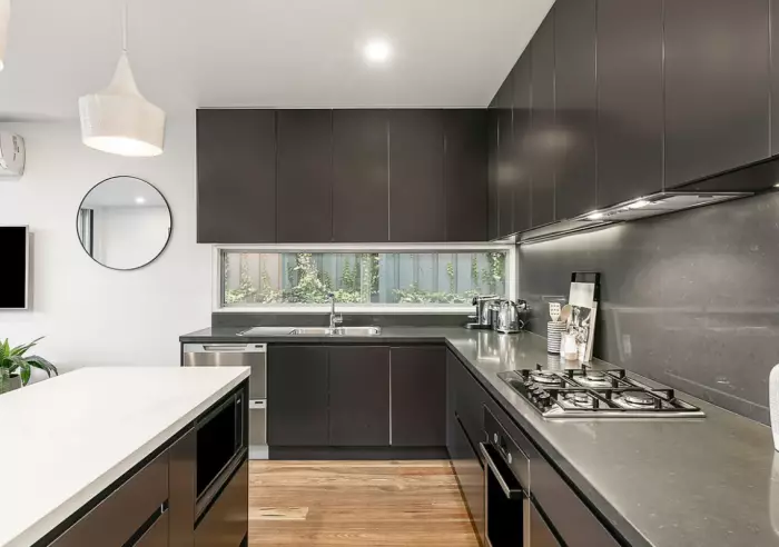 - Fully equipped modern kitchen with stone benchtops, gas cooktop, electric oven, double dishdrawer, and plenty of cupboard space