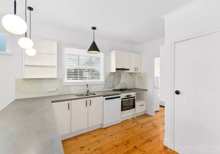 The property includes two generous bedrooms, each with built-in robes, and a large central bathroom complete with both bath and shower. The hallway offers extensive built-in storage, ensuring a place for everything while maintaining a clean, uncluttered aesthetic.