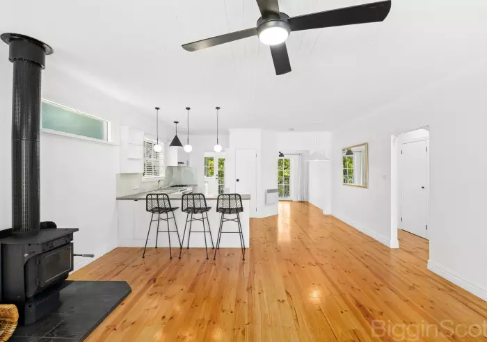 Positioned in a peaceful residential enclave, this superbly presented residence embodies the essence of contemporary country living. Polished timber floors, a soft, light-filled palette, and quality modern fittings create a sense of relaxed sophistication throughout. Every element has been carefully chosen by the interior designer owner, whose considered selection of materials and details brings warmth, balance and effortless style to each space. The open-plan living, dining and kitchen area flows seamlessly to a charming sunroom with French doors opening to the elevated rear deck that provides sweeping views over the neighbourhood to the nearby hills — the perfect setting for long lunches, evening gatherings, or quiet moments taking in the scenery.