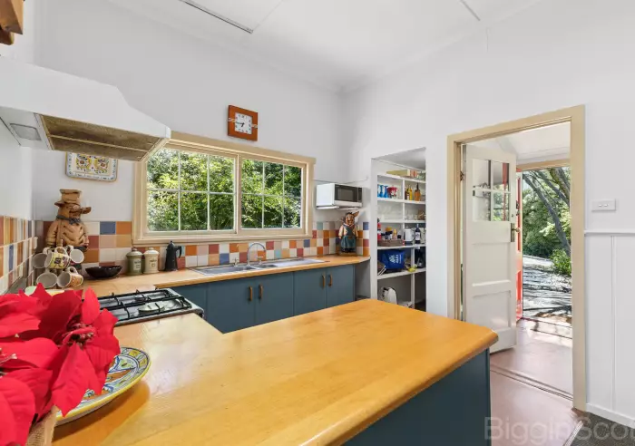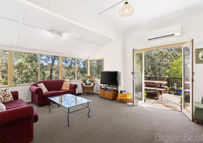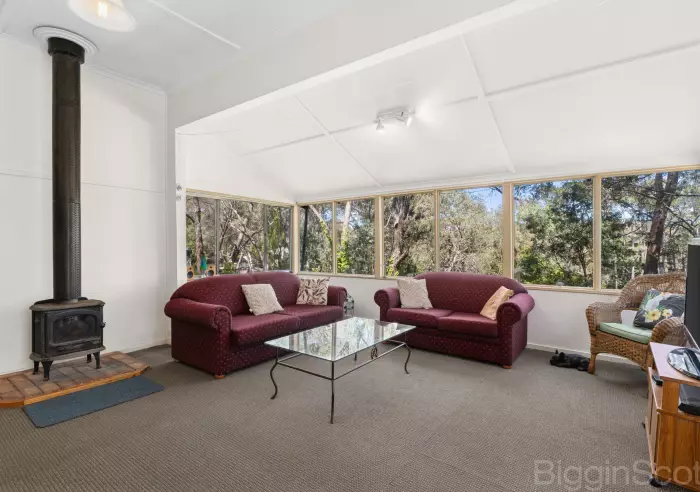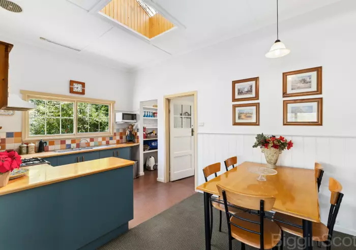 Step inside to discover a warm and inviting interior that blends cottage charm with practical comfort. Large windows fill the home with natural light, while the spacious lounge with woodfire heater provides a cosy retreat overlooking the treetops. The country-style kitchen features timber benchtops, gas cooking, and plenty of storage, adjoining a bright dining area perfect for casual meals or entertaining. A neat bathroom and laundry complete the home’s practical layout.