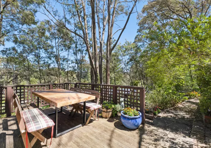 • Woodfire heating and elevated outdoor deck with treetop outlooks.