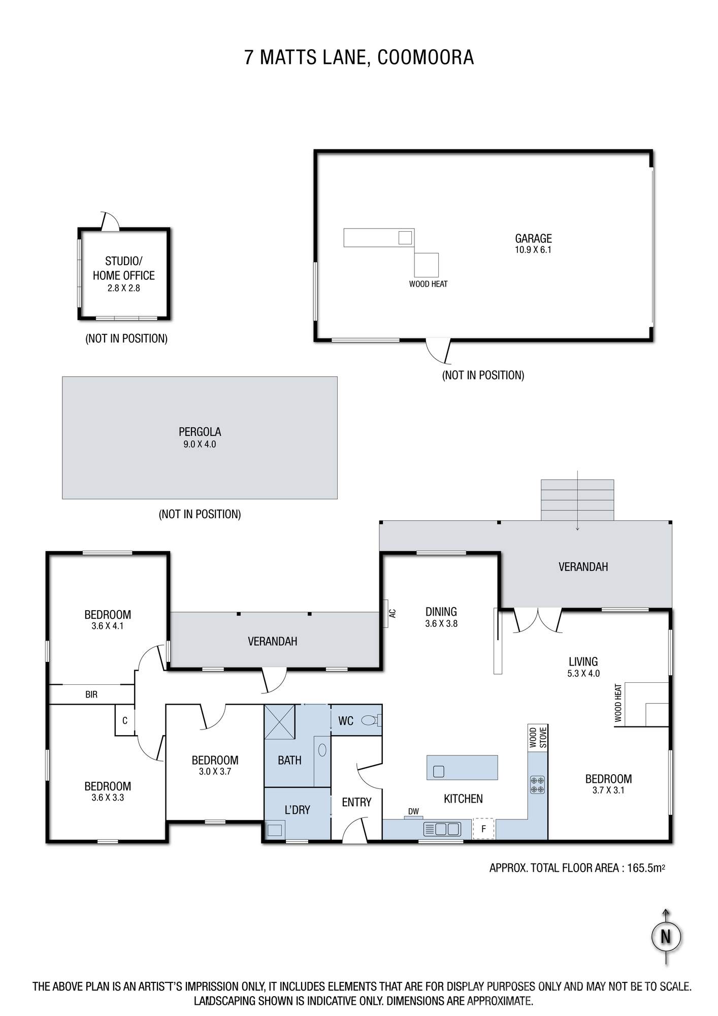- Large 10.9m x 6.1m shed with wood heater, separate studio/home office and covered alfresco area.