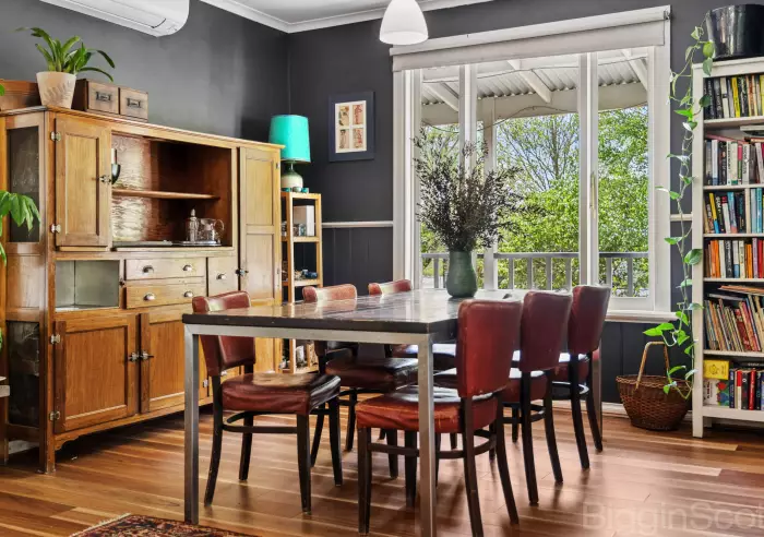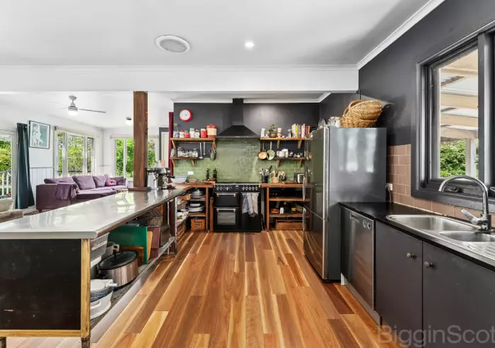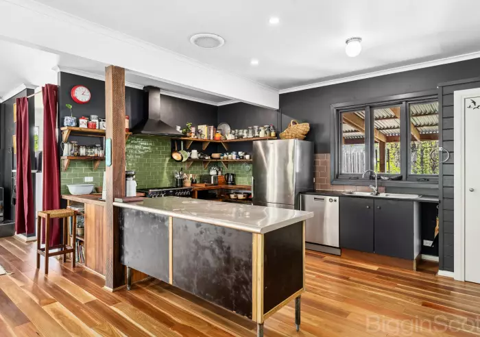 The classic weatherboard façade opens into light-filled living and dining spaces with timber floors and a wood heater complete with a cooktop. The rustic-style kitchen showcases warmth and character with timber benchtops, open shelving, a green tile splashback and a freestanding cooker, true heart of the home.