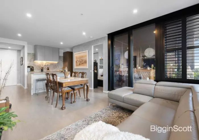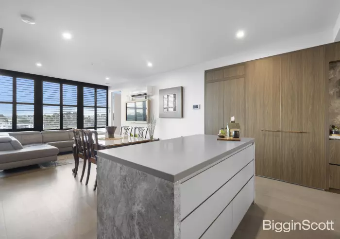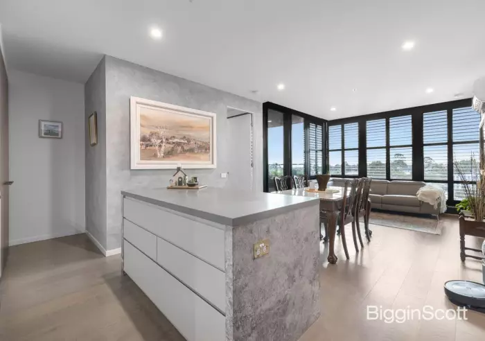 Filled with natural light, the apartment features spacious open-plan living and dining areas framed by floor-to-ceiling windows and plantation shutters. The modern kitchen is beautifully appointed with stone benchtops, Miele appliances including induction cooking and a dishwasher, and a stylish island breakfast bar.