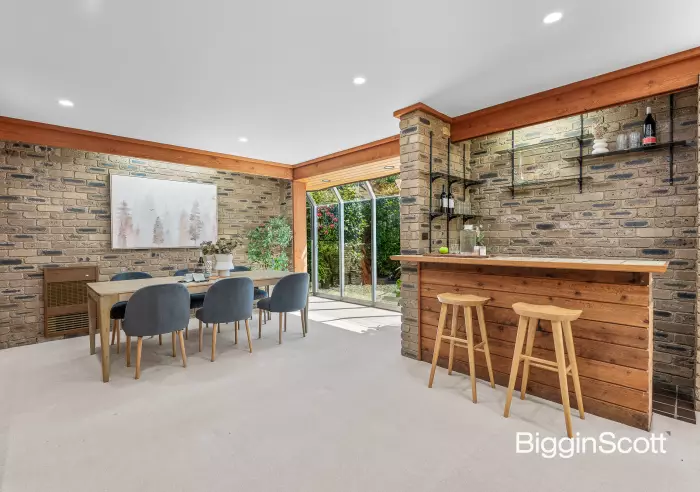 A spacious formal lounge and dining room span off a central entertainer's bar and benefit from framed by twin deep-set, floor-to-ceiling atrium windows with timeless elegance and a leafy outlook into the front yard.