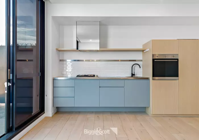 Large open plan kitchen and living with timber floors, spilling out to a large balcony with amazing city views!